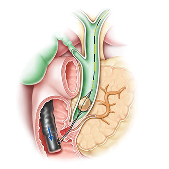 Un stent (endoprótesis) es un pequeño tubo de metal o plástico tubo que se coloca a través de la obstrucción en el conducto. Este pequeño tubo mantiene el conducto abierto para permitir la descarga de bilis al intestino delgado.